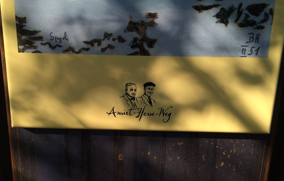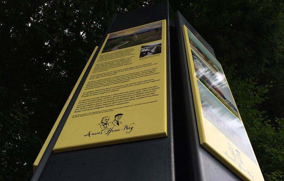 Am Amiet-Hesse-Weg stehen acht Infostelen. Sie sind als Dreieck, Sechseck und als Holzbeige gestaltet. Die Infostelen wurden von Beat Zurflüh kreiert und informieren die Spaziergänger und Wanderer über Leben und Werk der beiden Kunstmaler.