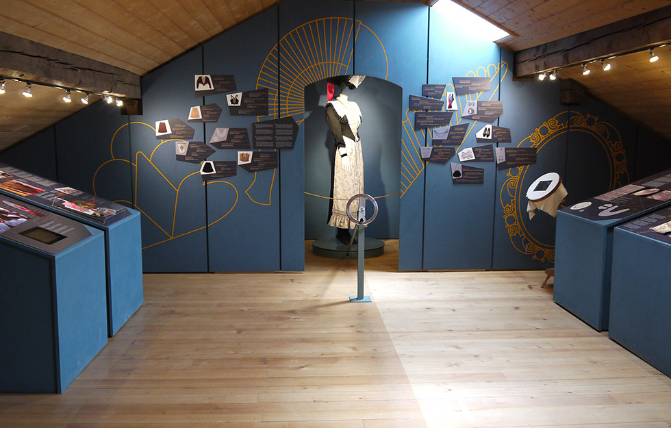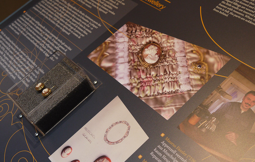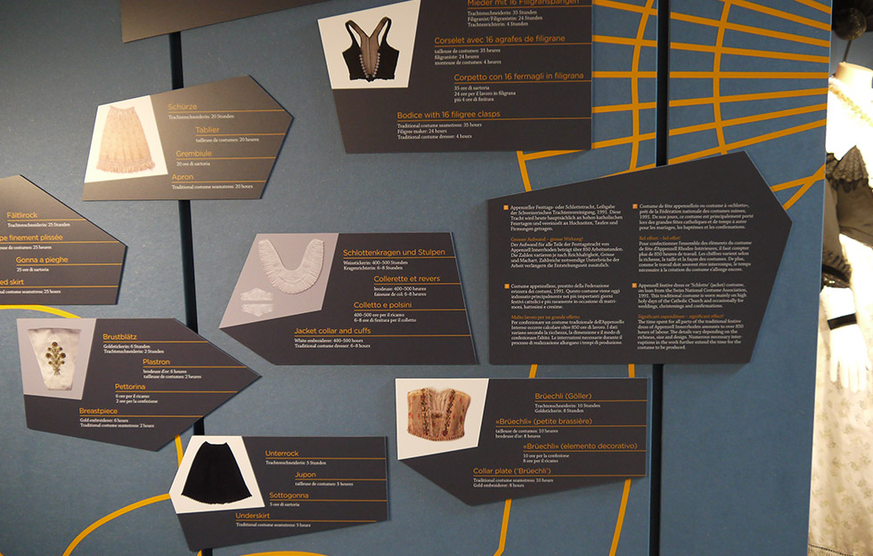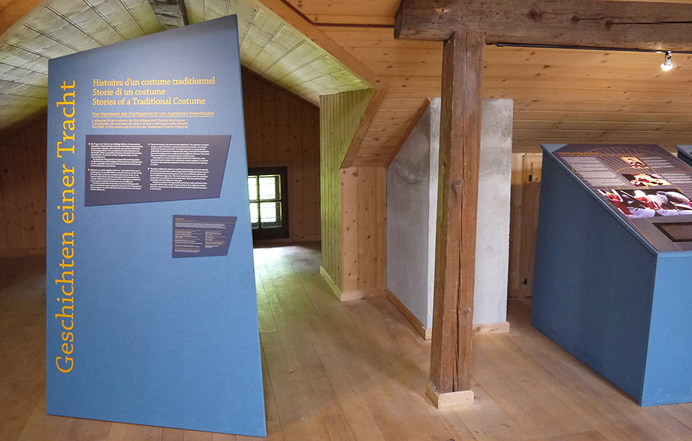 In der Wechselausstellung im Dachstock des Chalets Schafroth im Schweizerischen Freilichtmuseum Ballenberg werden Geschichten rund um die Appenzeller Festtagstracht erzählt. Der Fokus liegt dabei auf deren aufwändiger Herstellung. Die Besucherinnen und Besucher lernen verschiedene Handwerke kennen und begegnen den Menschen, die diese besonderen Fertigkeiten beherrschen.