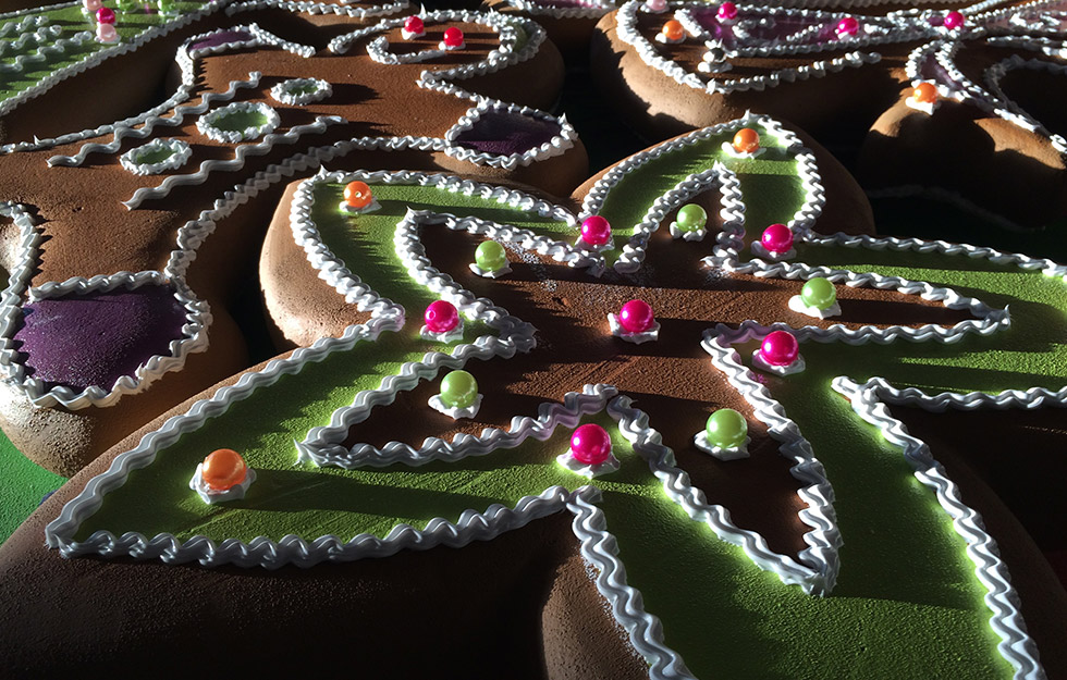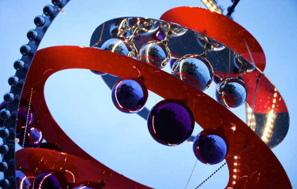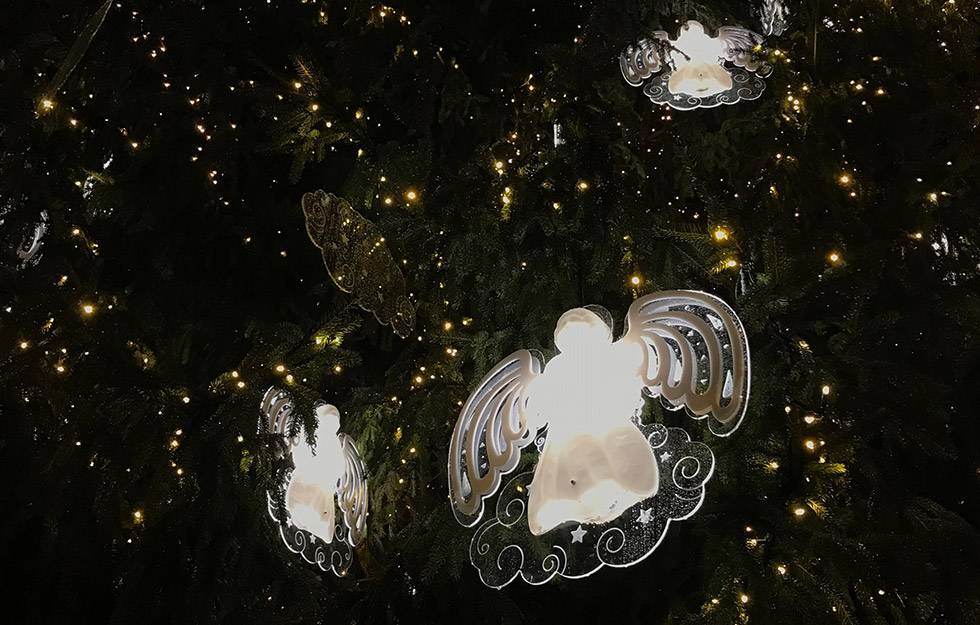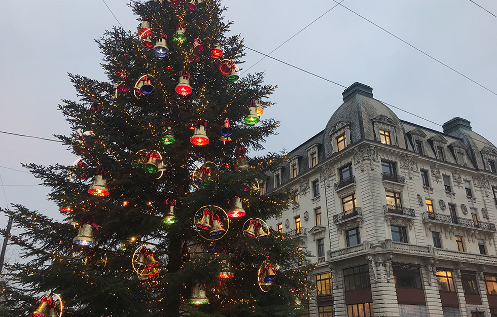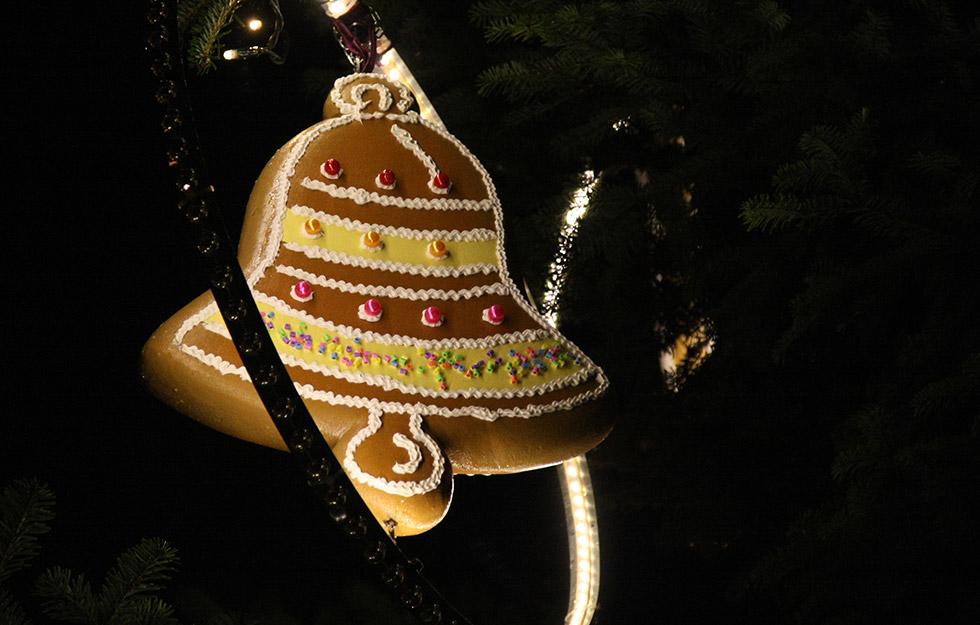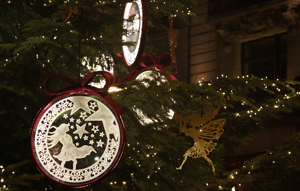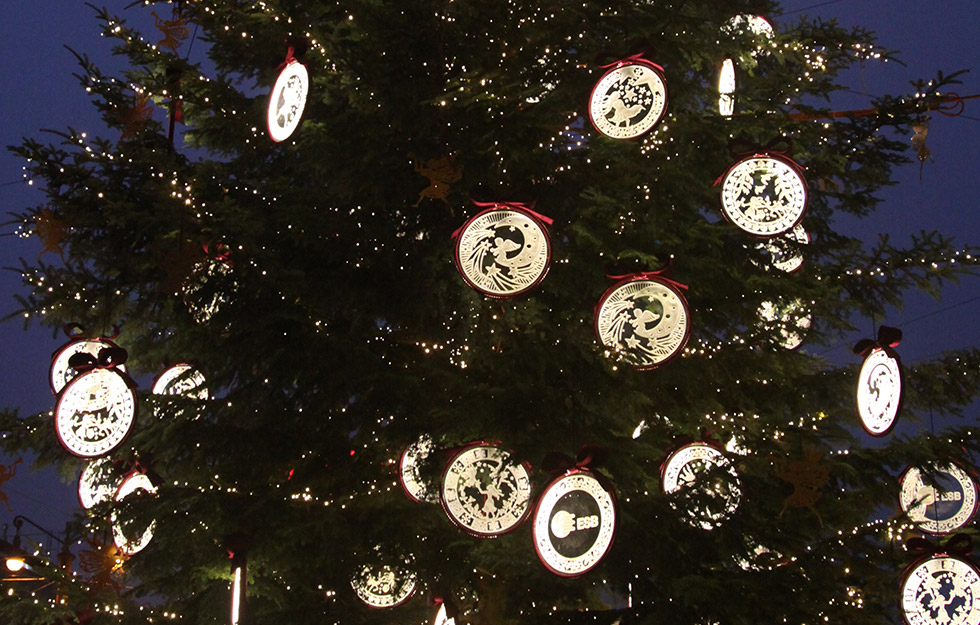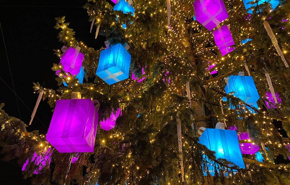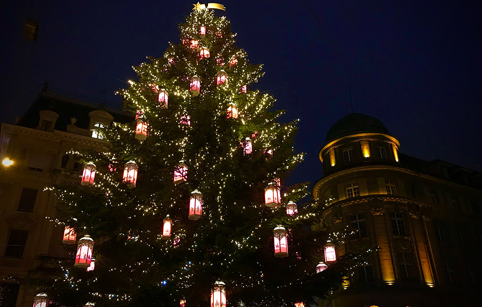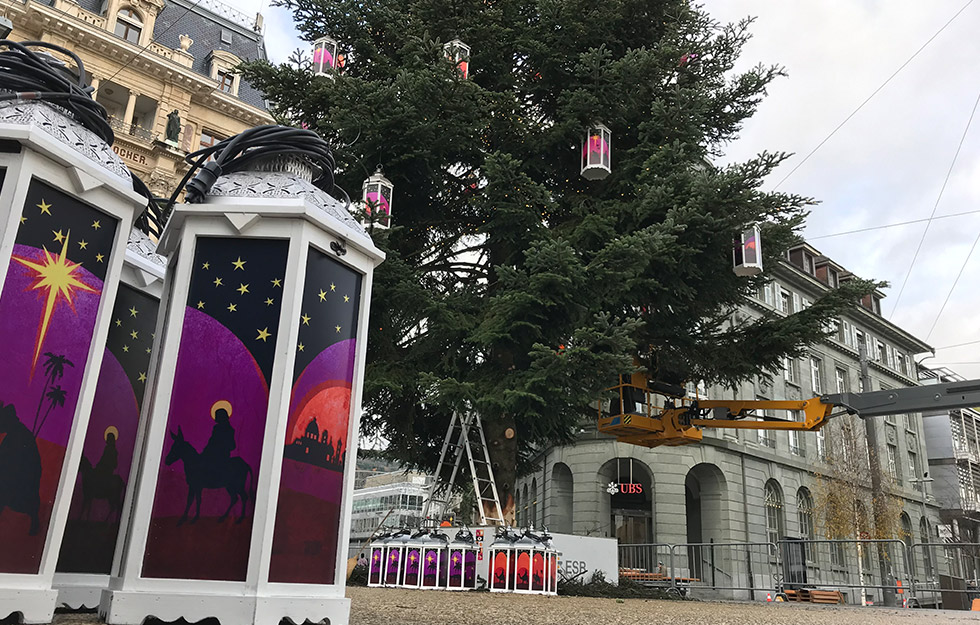 Der jährlich individuell hergestellte Baumschmuck von atelier bpunkt ist seit Jahren beglückender und vielbestaunter Teil dieses bilinguen Weihnachtsevents. Die grosse Herausforderung dabei ist jeweils, dass der Baumschmuck einerseits einzigartig und auffallend ist, andererseits aber auch wetterfest, stabil – und zugleich nicht zu schwer. Des Weiteren müssen wir immer mitberücksichtigen, dass nicht jede Tanne die gleiche Struktur und Tragkraft hat.