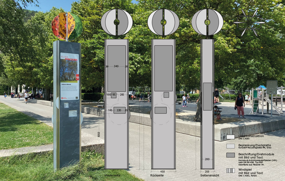 Da die Anlage in einer Uferschutzzone steht, wurde eine spezielle, rückstandsfrei entfernbare Bodenverankerung eingesetzt. Bewegliche Drehteller vermitteln die Inhalte spielerisch und die bebilderten Windräder machen schon von weitem auf sich und die Themen aufmerksam.