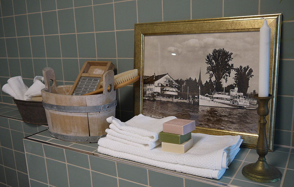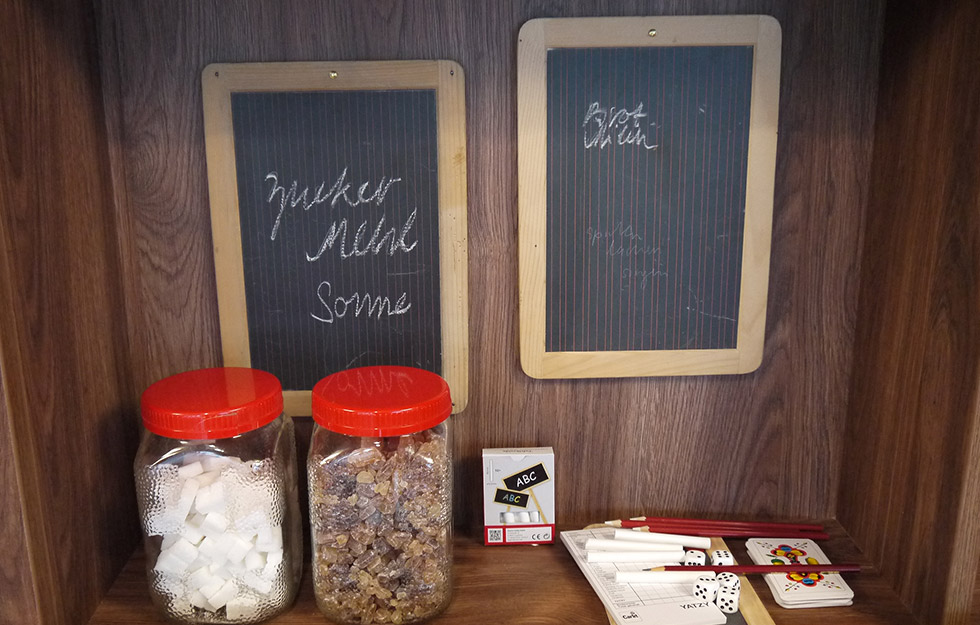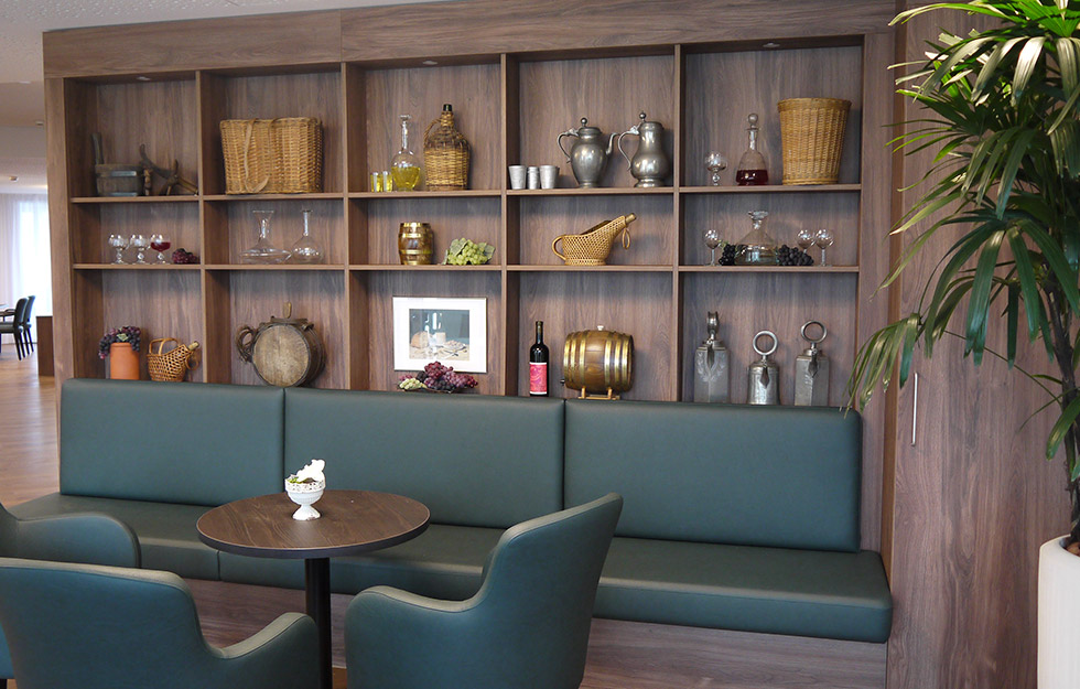 Um den Umzug von der gemütlichen eigenen Wohnung ins Heim zu erleichtern, hat Senevita die Aufenthaltsräume zu wahren Erinnerungs-Schatzkammern umgestalten lassen. Mit Erinnerungen zum Anfassen, echten Gegenständen, Bildern und Geräten aus früheren Jahren, an die viele Seniorinnen und Senioren noch eine sehr lebhafte Erinnerung haben. Kommt Besuch, so kann der Opa dem Enkel auch mal vorführen, wie das damals war, als man noch mit Negativfilm fotografierte. Auch die Aktivierungstherapie ist dankbar für diese haptischen Sinneseindrücke. Und die Bar wurde zu einem unerwartet beliebten Treffpunkt. Bald schon wurde das Bücherregal um persönliche Erinnerungsstücke der Bewohnerinnen und Bewohner ergänzt.