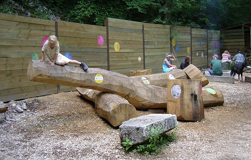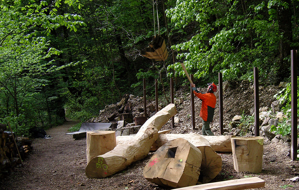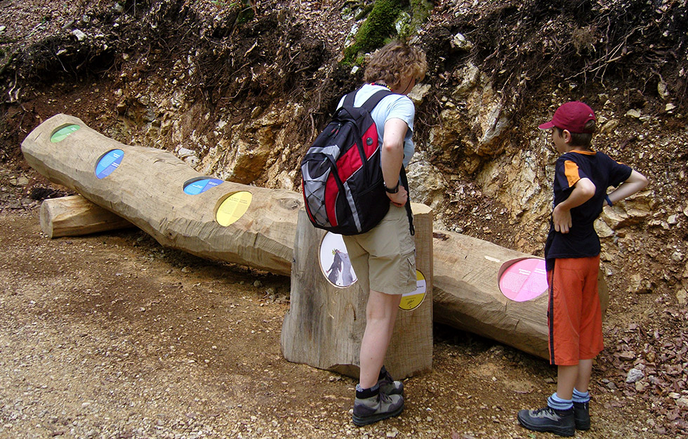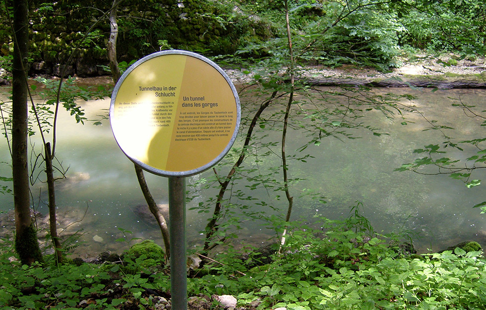 atelier bpunkt hat den Weg konzipiert und gestaltet. Das Leitsystem informiert übersichtlich und mehrsprachig auf runden Infotafeln über die Energiegewinnung einerseits und die Taubenlochschlucht andererseits. Die Beschilderung hilft bei der Orientierung auf der eindrücklichen Wanderung. Auch den Rastplatz beim Kraftwerk haben wir eingerichtet. Hier legen die Wanderer eine Pause ein und erfahren spielerisch noch einmal mehr über die Ökostromproduktion.